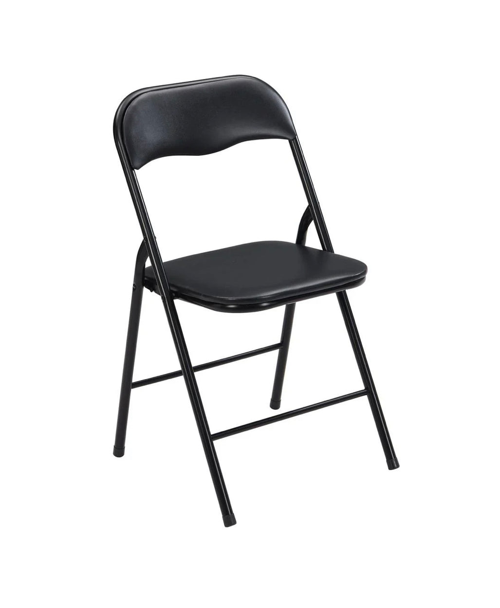 Black fold up chair. Lightweight steel frame with padded vinyl seat.