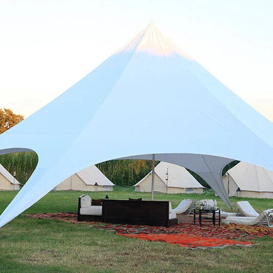 Our Starshade Event Tent stands roughly 5.3m tall and covers 74m² which equates to roughly 60 people seated or 110 people standing. - HIRE ONLY